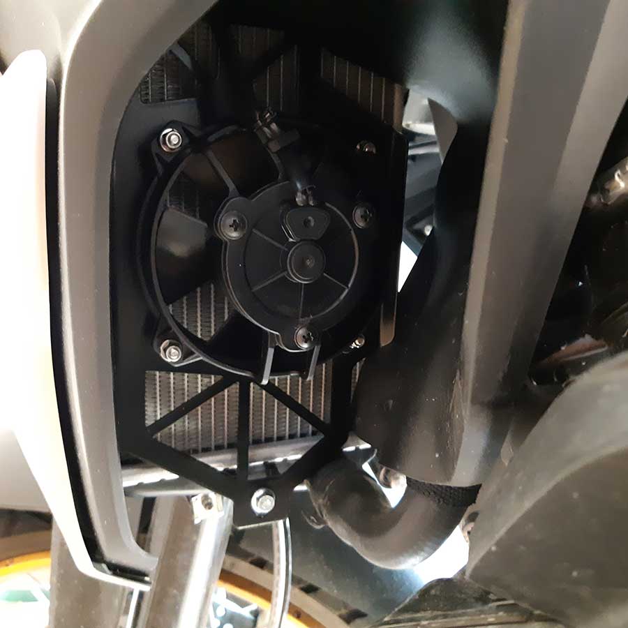 The additional fan kit for R1200-1250 GS/ADV-LC that we designed and manufactured is a highly useful accessory. During use in medium/high temperatures, the cooling fan is often on for extended periods. Not to mention the challenging situations that frequently arise during rides with a passenger, fully loaded, in the mountains, or off-road. With our kit, cooling times are cut in half, benefiting both the engine and perceived temperature!