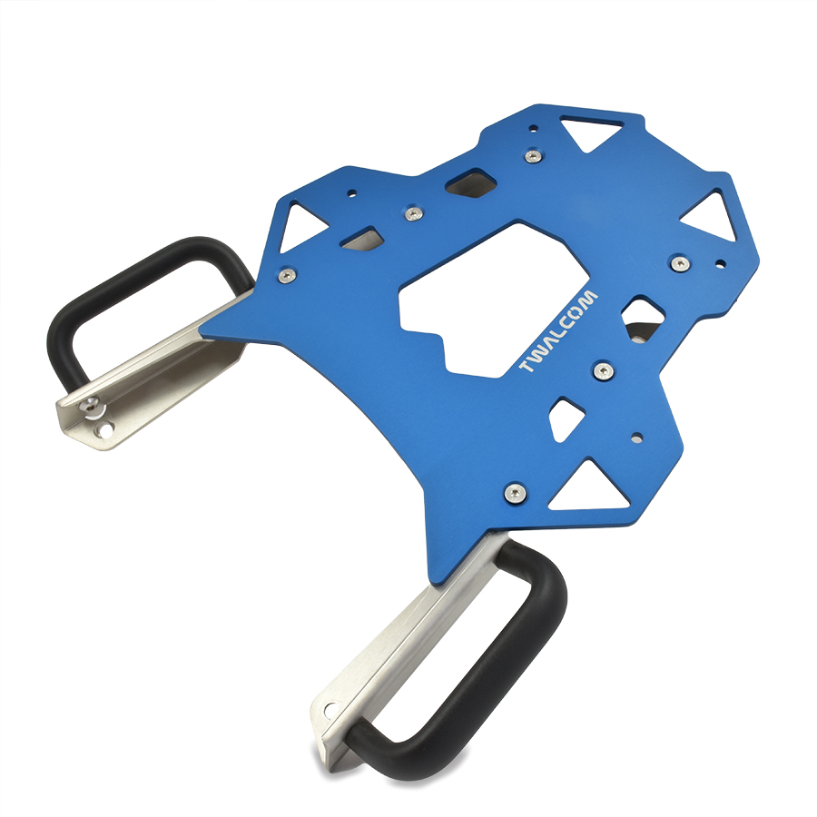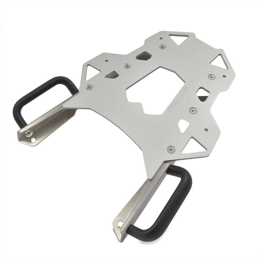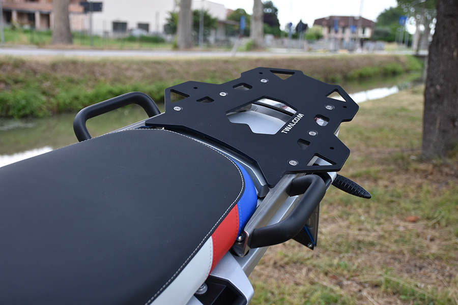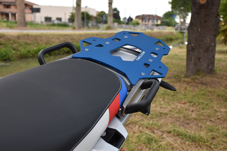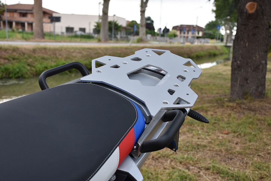 The system consists of a solid stainless steel mounting base equipped with removable handles and an extremely sturdy luggage rack plate already prepared with 4 M6 threaded inserts for the subsequent and optional placement of the universal mounting system for top case code AA.02.01784.001.013.