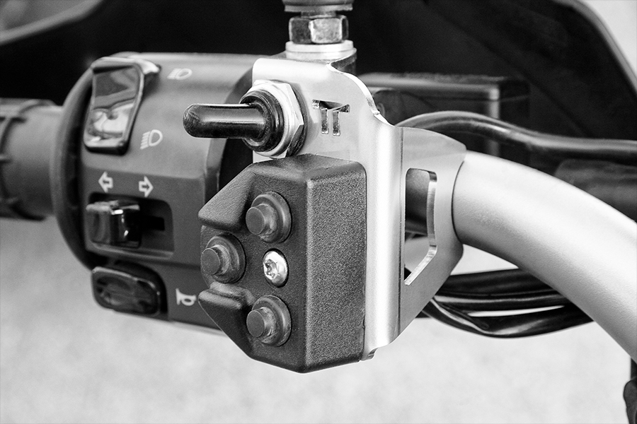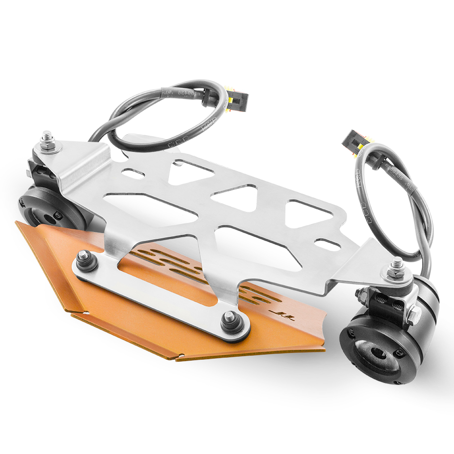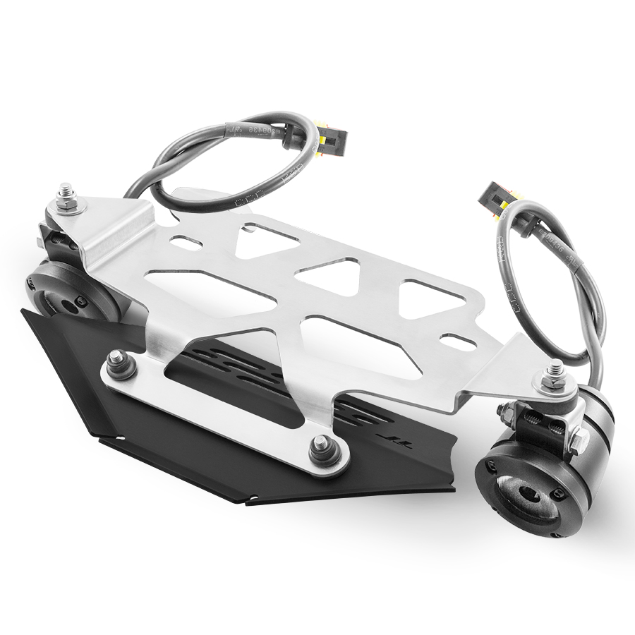 This kit consists of a very robust mounting bracket specifically designed for the KTM 990ADV that serves as a support structure for positioning 2 High Performance LED lights complete with adjustment brackets and also for the air duct for cooling the electronic control unit.