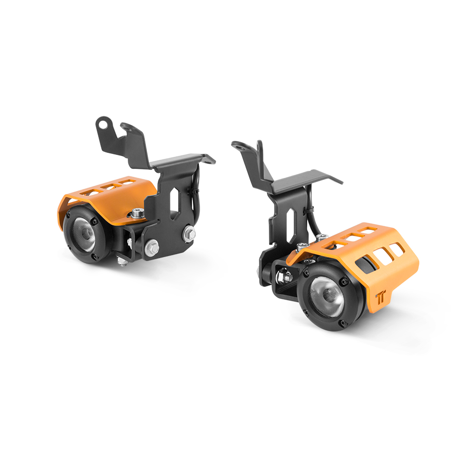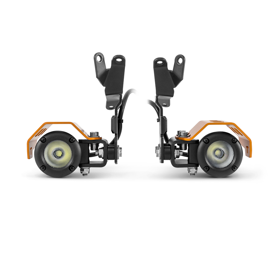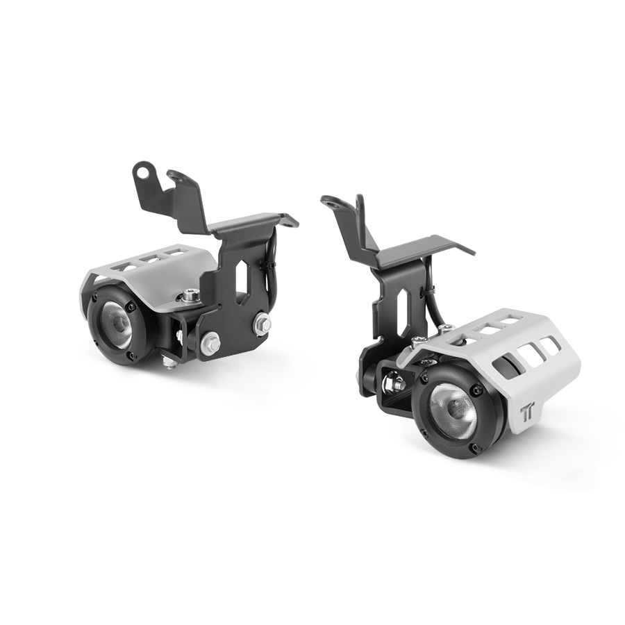 This kit consists of two very sturdy mounting brackets specifically designed for KTM 1050/1090/1190ADV and 1290 Super Adventure T, which serve as support for positioning the High Performance LED Lights complete with aluminum protections.