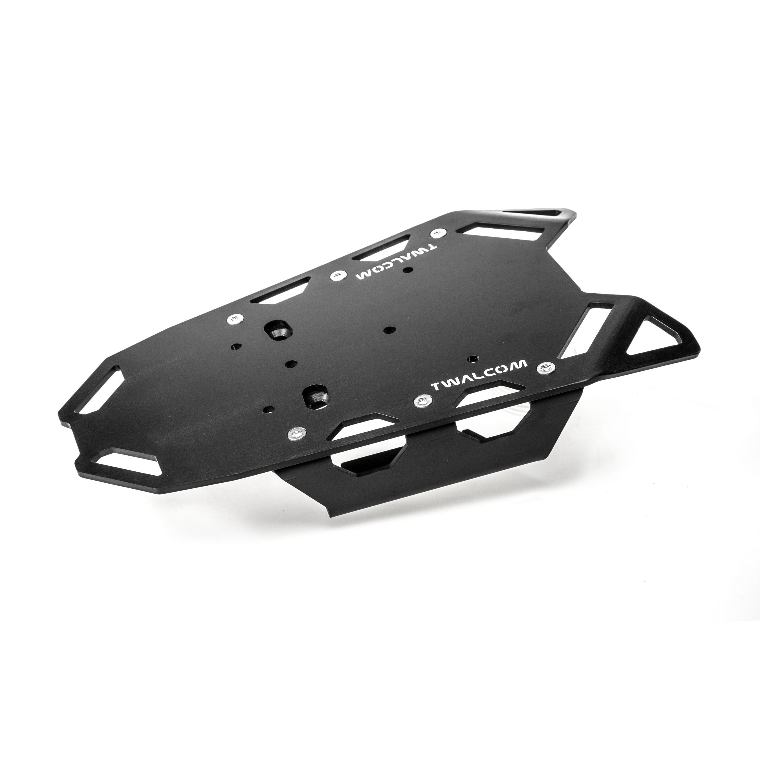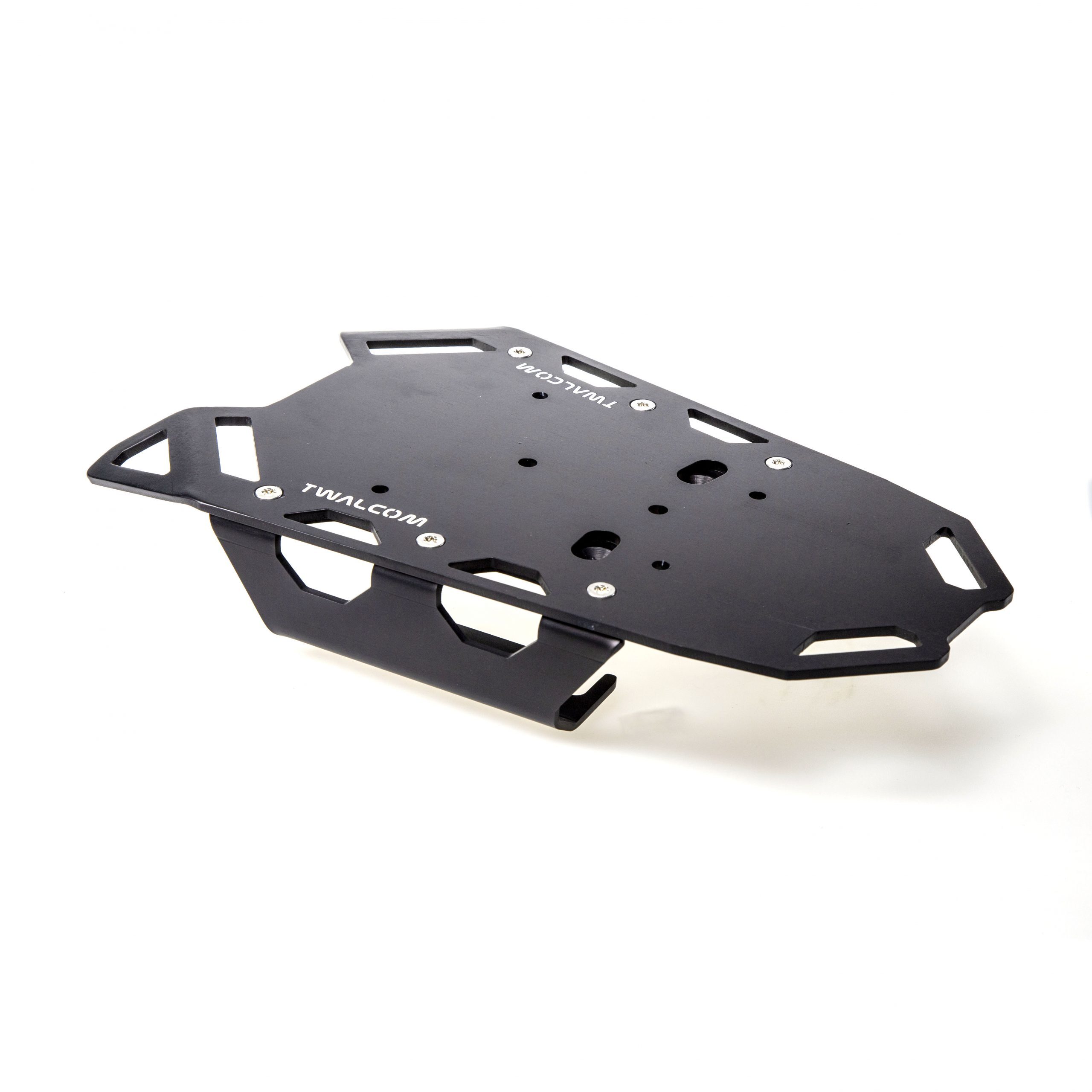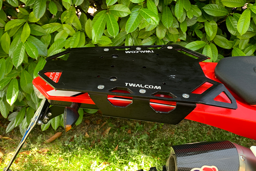 This extremely robust luggage rack plate is mounted directly to the motorcycle frame and has been specifically designed for optimal luggage attachment. The plate, in addition to being constructed with top-quality materials, provides a large flat loading area suitable even for bulky loads. The system consists of an extremely robust luggage rack plate already equipped with numerous wide slots for secure luggage attachment and two lateral support brackets that can also be used for luggage attachment.