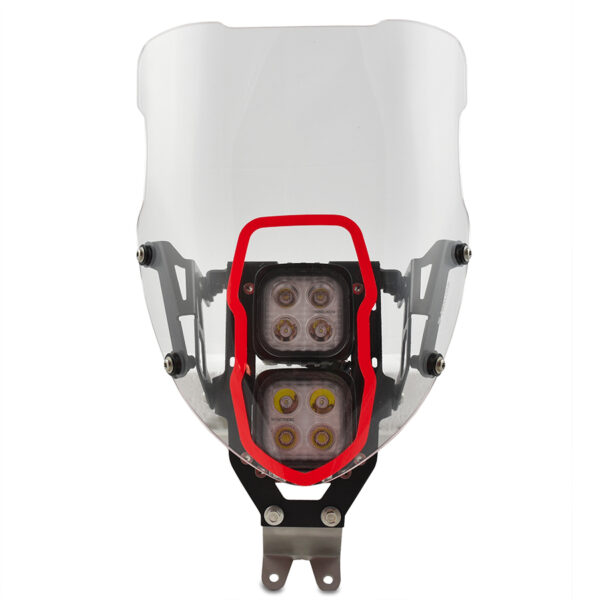 LED lights with CE approval in progress. The package includes: anodized Peralluman support frame – high-thickness windscreen with adjustable angle, height 360 mm – 2 Vision-X 4 LED lights with 10R-05.E9.22034 CE approval (2,115 lm. (RAW) – 1,480 lm. with Polycarbonate lens – 4 x 5w. – DC9-32v.) width 2×10° + 2×25° for each light – 2 mounting/adjustment brackets, turn signal supports (right + left), dedicated “Made in Twalcom” plug and play wiring ready for direct connection to the original KTM/Husqvarna connector.