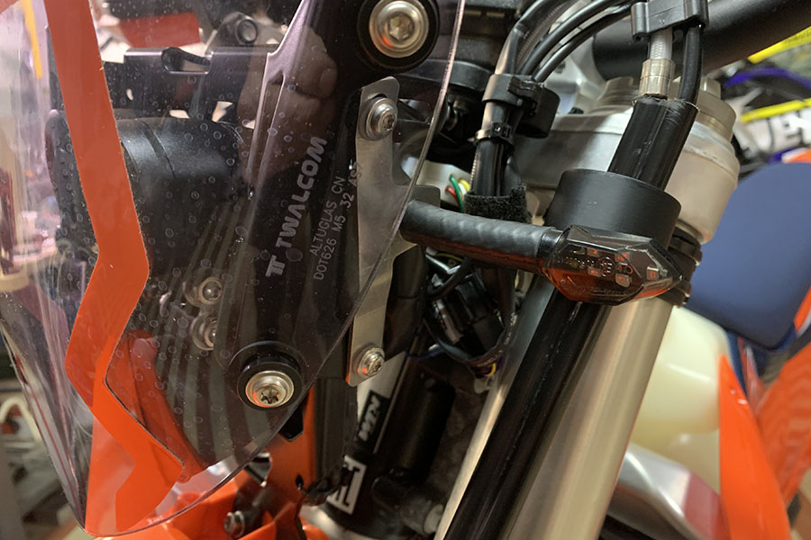 The R+L mounting bracket set is specifically designed for quick mounting/dismounting of road-legal turn signals directly to the frame of Rally Kit E-Light. This makes it possible to have a street-legal enduro bike that can be quickly converted back into a Racing enduro.