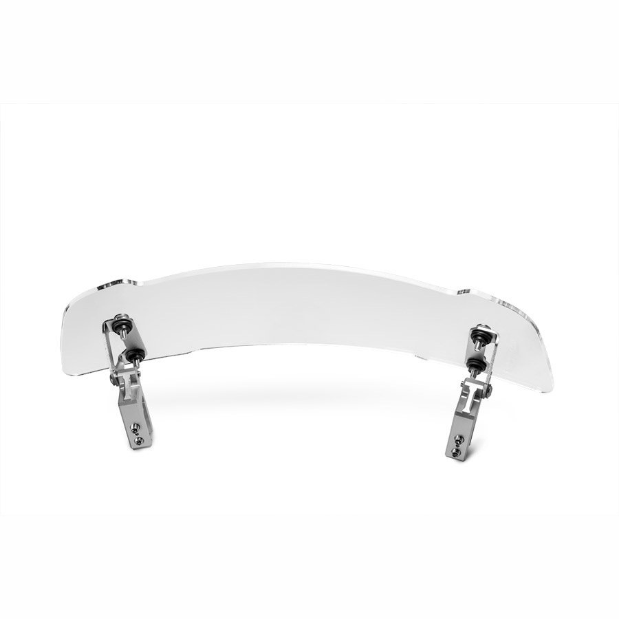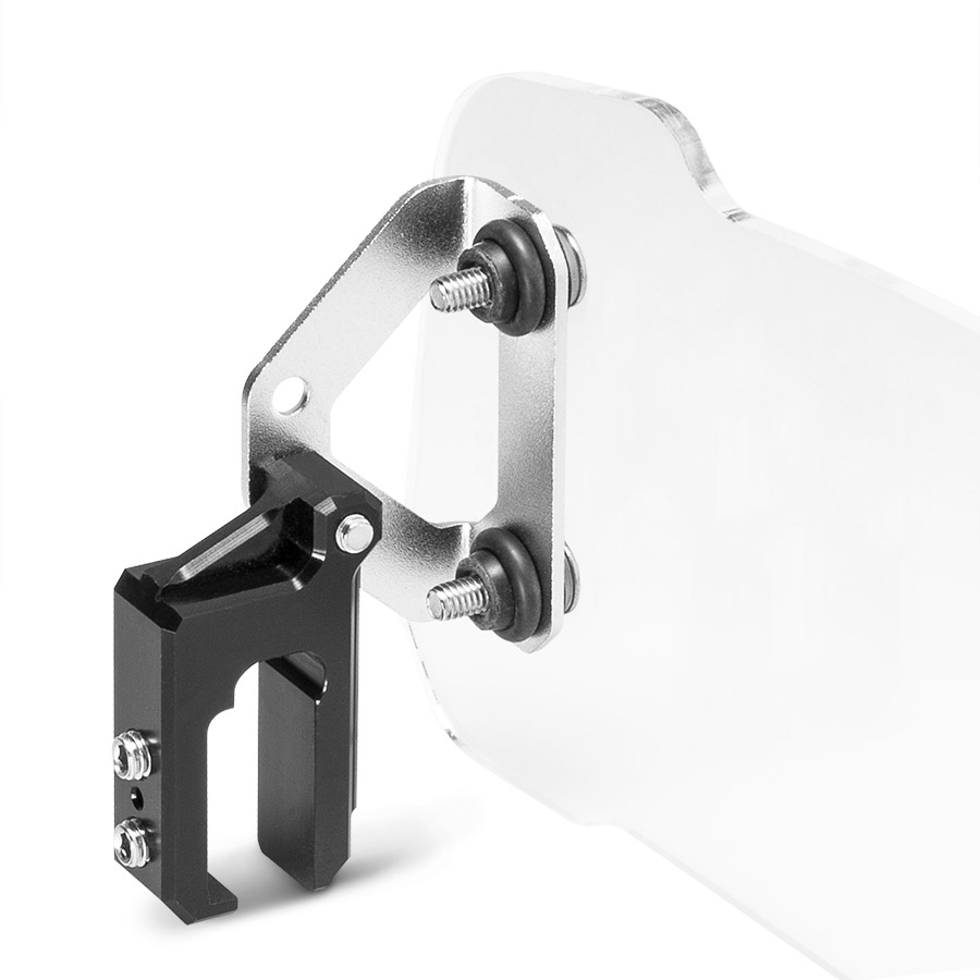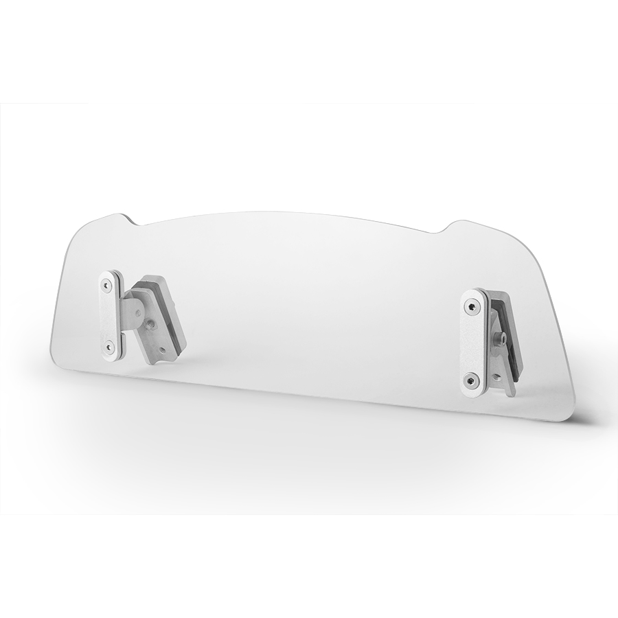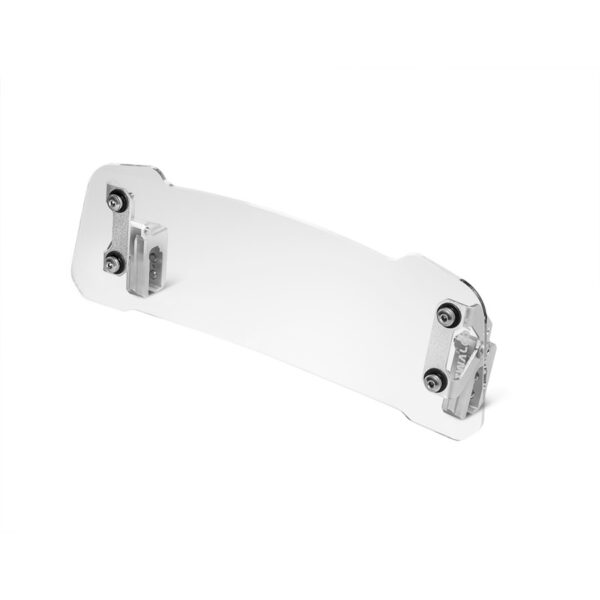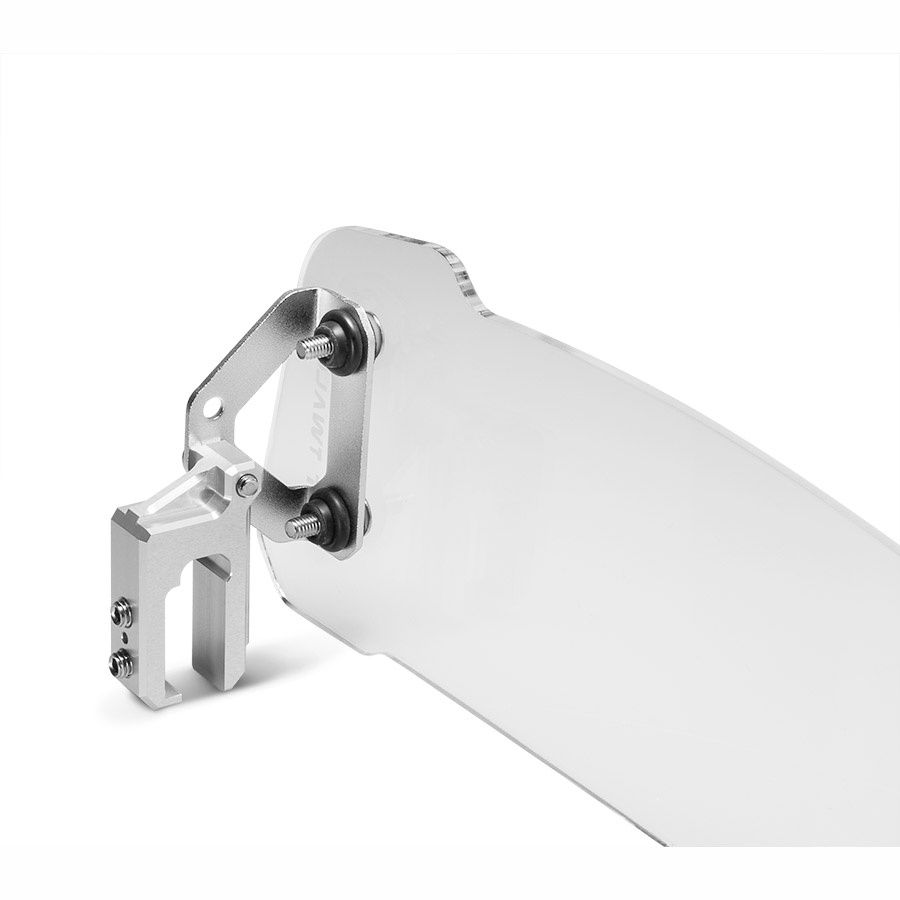 CNC-machined ergal brackets with fine-tuning adjustment. Large soft rubber contact surface for maximum grip and vibration dampening. Stainless steel micro-adjustment brackets for angle control, adjustable in height. Deflector mounted on anti-vibration elastic supports. Stainless steel mounting screws included.