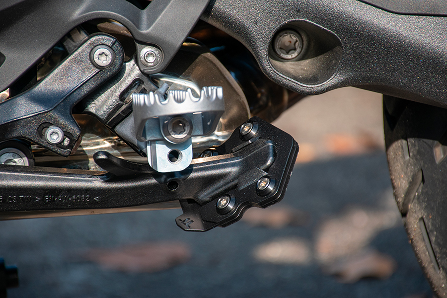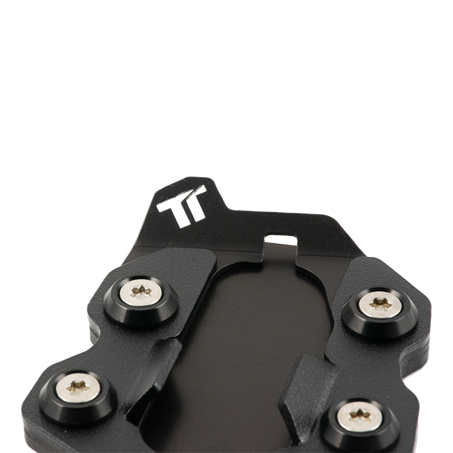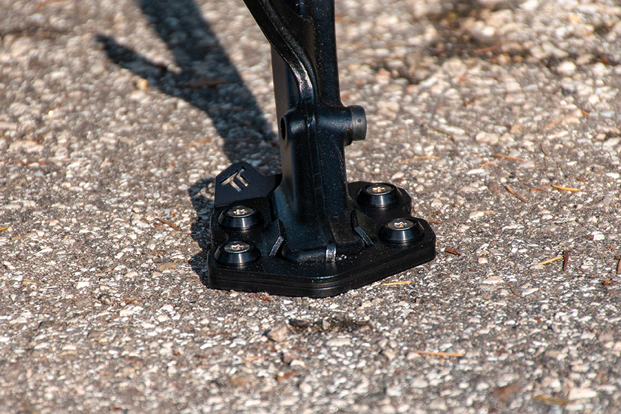 Il particolare bordo inferiore arrotondato consente la presa ottimale su ogni tipo di terreno ed aumenta la superficie di appoggio di oltre il 100% rispetto all’originale. Inoltre, lo spessore di 7 mm contribuisce a ridurre l’inclinazione della moto, facilitandone il rialzamento con minore sforzo.
