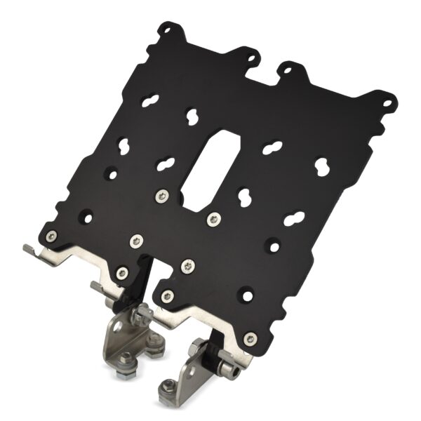 Base di fissaggio per 2 Rugged Phone da noi progettata e prodotta, è stata appositamente realizzata per posizionare due Rugged Phone in posizione Verticale e consentire un vasto range di regolazioni. La particolare costruzione consente una notevole libertà di posizioni: è infatti possibile fissare la doppia staffa sia internamente che esternamente ai risers, con tre ulteriori posizioni della base.