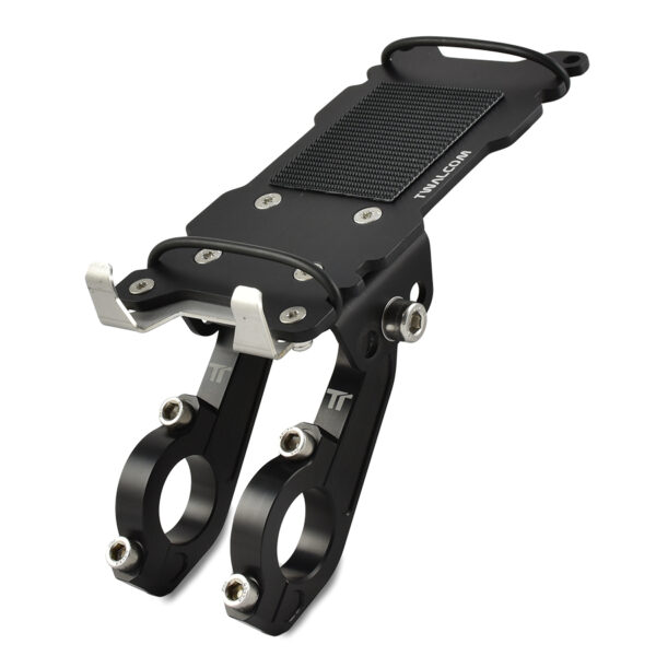 La doppia staffa per Rugged Phone/GPS da noi progettata e prodotta, è stata appositamente realizzata per consentire un vasto range di posizioni di fissaggio. La particolare costruzione consente una notevole libertà di posizioni: è infatti possibile fissare la doppia staffa sia internamente che esternamente ai risers, con tre ulteriori posizioni della base.