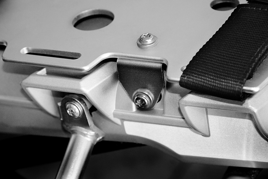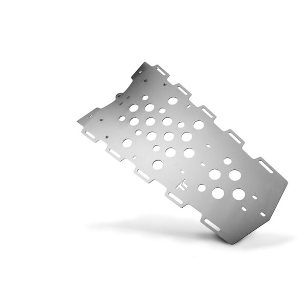 Il materiale di prima qualità usato per la costruzione, lo spessore di ben mm. 4, il fissaggio diretto al telaio con ben 10 punti di fissaggio, l’ulteriore appoggio posteriore in acciaio inox e le 10 asole dedicate alle cinghie, rendono questa piastra un vero “mulo da soma” adatto ai viaggi estremi. Inoltre la particolare collocazione della piastra contribuisce all’ottimizzazione dell’assetto durante la marcia e l’avvicinamento delle masse al baricentro naturale della moto.
