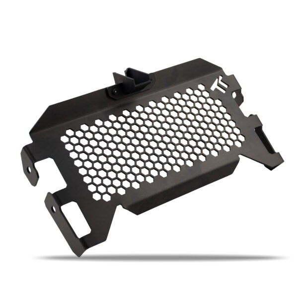 La protezione del radiatore, dotata del supporto di posizionamento del sensore della temperatura, è costituita da una robusta protezione in alluminio nervato che protegge in modo uniforme il radiatore dai tanti possibili sassi che possono provenire dalla ruota anteriore.