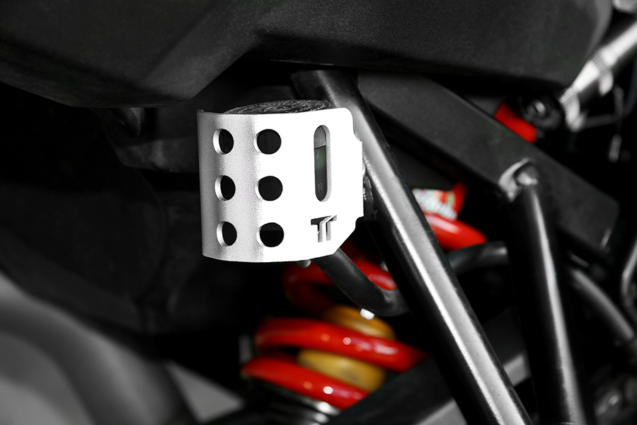 Questa protezione da noi progettata e prodotta con materiali di prima qualità offre un’ottima protezione al contenitore dell’olio del freno posteriore dal contatto con sassi e rami. L’asola ricavata nella parte frontale, consente l’immediata lettura del livello dell’olio.