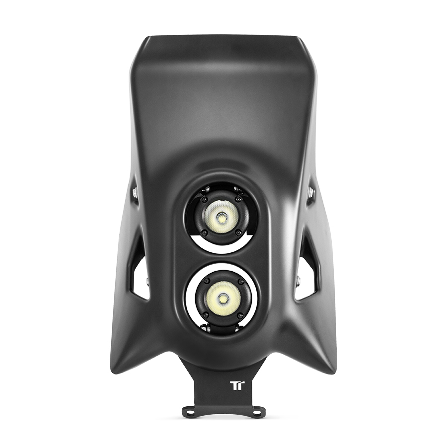 Per il nostro Kit abbiamo scelto i nuovi fari Single LED High Performance Super Slim by Twalcom Racing particolarmente adatto per questo tipo di installazione e soprattutto in virtù dell’estrema robustezza, delle contenute dimensioni, del peso contenuto, delle performance e del bassissimo consumo (10 W.) con un risparmio di ben 15W rispetto alla lampada originale. Questo risparmio di energia rende possibile il montaggio di una eventuale strumentazione aggiutiva (GPS, Roadbook o altro) senza mettere in crisi la batteria. Il telaietto di supporto è inoltre predisposto per il montaggio di una presa di corrente 12V. ed offre ampio spazio e protezione per il montaggio di una eventuale staffa per GPS.