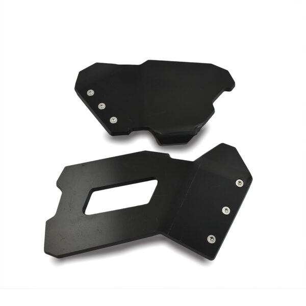 Questo robustissimo set di protezioni aggiuntive DX e SX nasce appositamente per la Piastra Paramotore Hard Enduro versioni Euro 4 e Euro 5. Leggere e robustissime, si montano in meno di 10 minuti e offrono una eccellente protezione alla parte frontale/laterale del carter volano e frizione del motore. La protezione destra copre anche completamente le tubazioni del circuito di raffreddamento. Le protezioni dall’elevato spessore laterale sono estremamente protettive e sono disegnate e conformate appositamente per non intralciare minimamente il movimento anche con stivali OFFROAD.